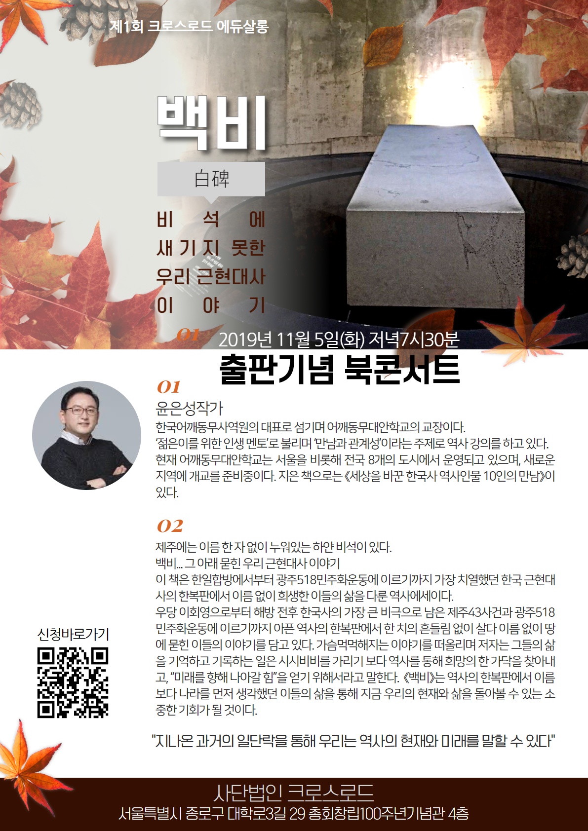 <세상을 바꾼 한국사 역사인물 10인의 만남> 윤은성작가의 두 번째 책, <백비> 출판을 기념해서 크로스로드 에듀살롱 첫번째 모임을 열어봅니다. 시간은 2019년 11월 5일 화요일 저녁7시30분입니다. 장소는 종로5가에 위치한 < 총회창립100주년기념관> 4층 크로스로드 '광야의 영성' 세미나홀입니다.