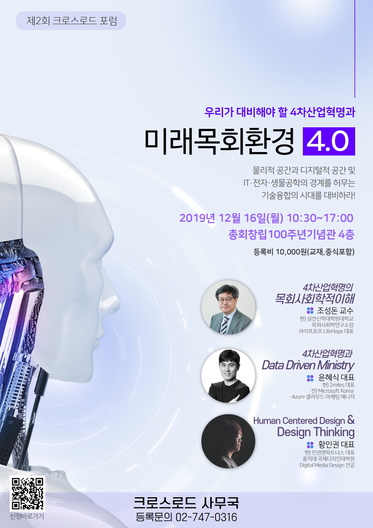 크로스로드 포럼~ 두 번째 시간입니다. 이번 포럼의 키워드는 <4차 산업혁명>입니다. 얼마전 5G시대가 열리면서 그 어느때보다 많이 듣고 있는 단어, 바로 4차 산업혁명의 시대라는 말입니다. 그런데, 이 새로운 패러다임에 대해 정확하게 이야기해주는 사람이 없습니다. 정답은 없습니다. 다만, 시대를 읽고 준비하는 교회와 사역자들을 필요로 합니다. 세분의 전문가를 모시고 성큼 우리앞에 다가온 빅데이터의 시대, 목회환경은 어떻게 변화해갈지 가늠해보는 시간이 되었으면 좋겠습니다. 목회사회학이라는 새롭지만 익숙할 수밖에 없는 영역을 열어가고계신 실천신학대학원의 조성돈교수님과 빅데이터와 블록체인 전문가, 2miles의 윤혜식대표님, 그리고 인권앤파트너스의 황인권대표님 이렇게 세 분이 함께 모여 4차 산업혁명의 이야기보따리를 풀어놓습니다. 누구든지 오셔서 업어가시길 바랍니다. 관심있는 모든 분들을 초청합니다.