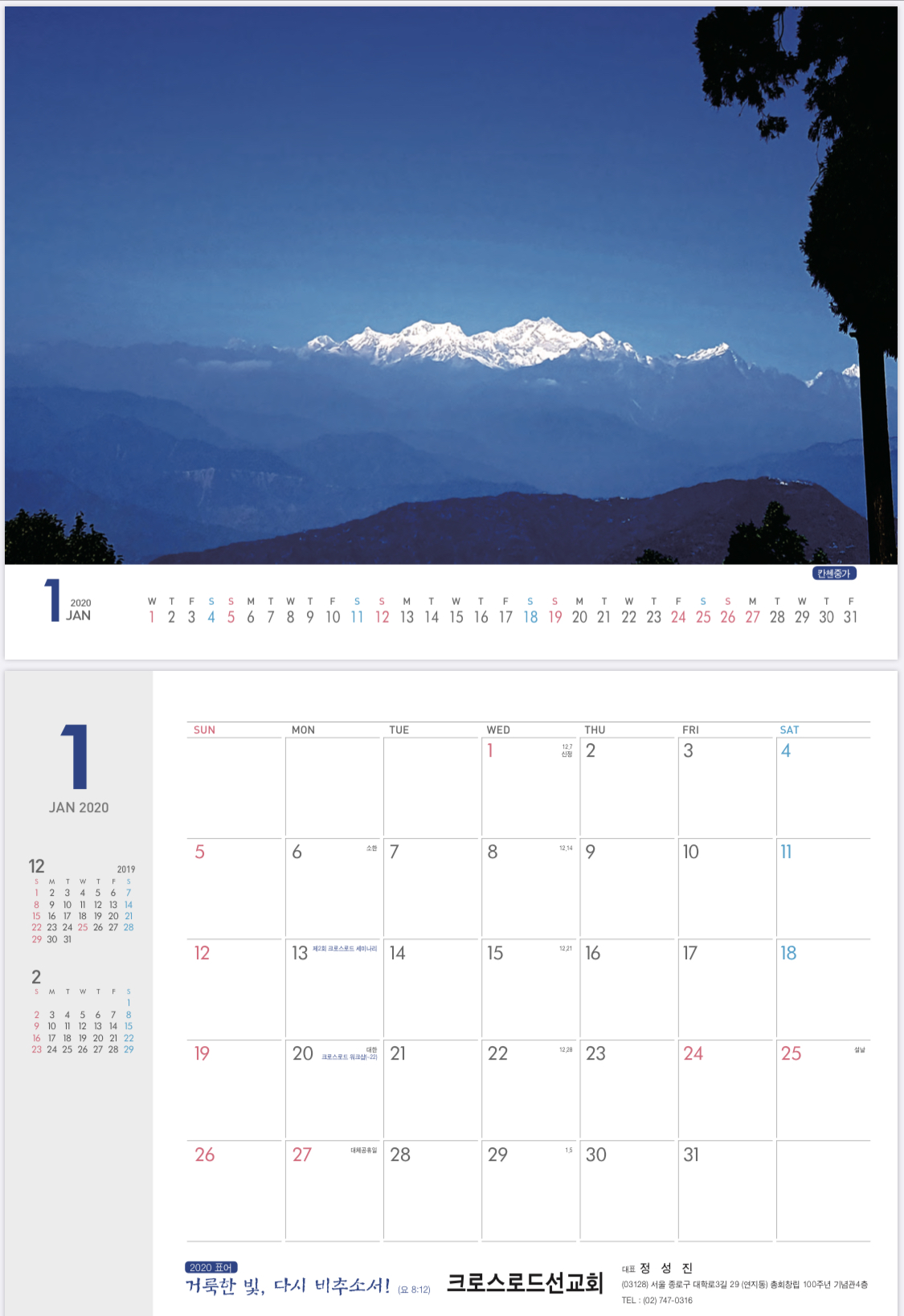 새해 탁상용달력을 준비하였습니다. * 개인 후원자분들에게는 본부에서 우편으로 발송해 드릴 예정입니다. * 신규 후원회원 안내 -사단법인 크로스로드 대표 정성진 목사 드림-