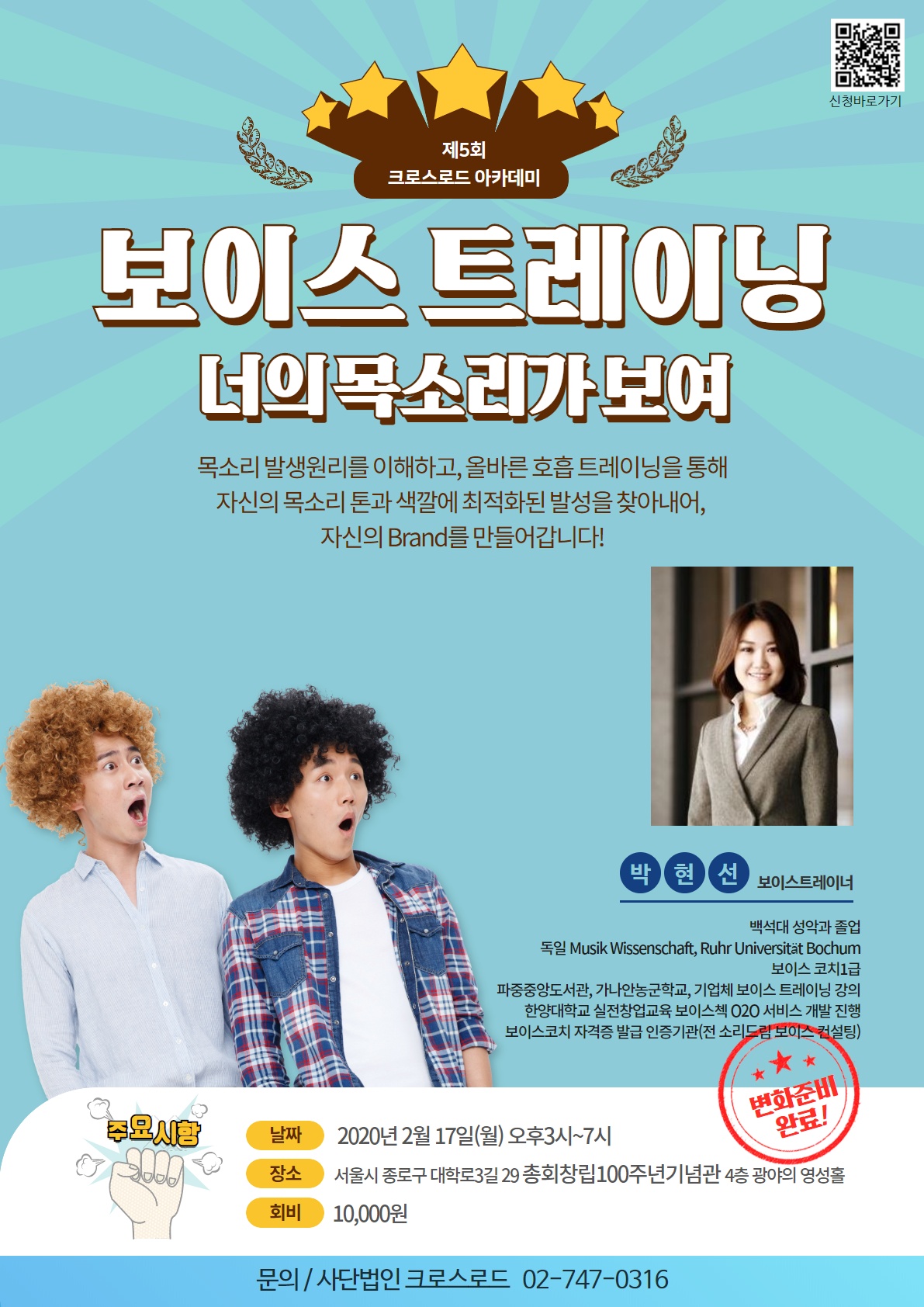 제 5회 크로스로드 아카데미 - 보이스 트레이닝 - 강사: 박현선 - 일시: 2월17일 (월) 오후3시-7시 - 회비: 10,000원