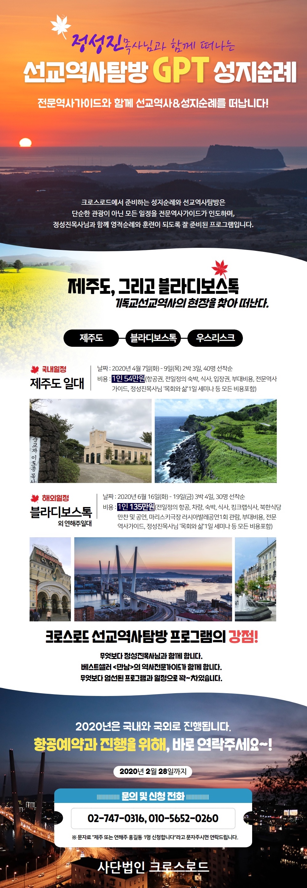 선택1. 국내 - 제주도 선교역사탐밤 GPT(2020.4.7-9) 54만원 선택2. 해외 - 블라디보스톡 선교역사탐방 GPT(2020.6.16-19) 135만원