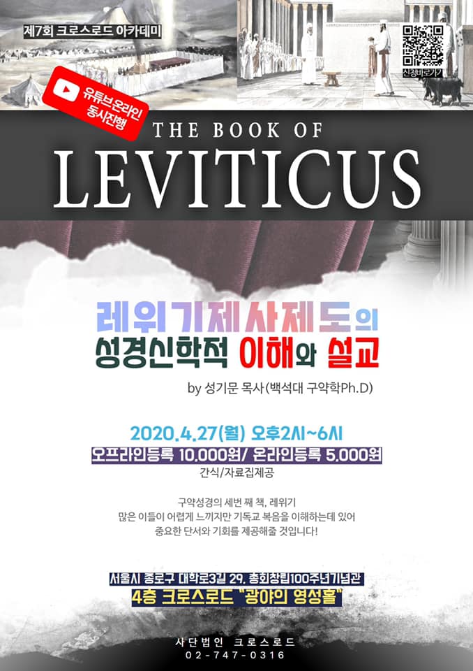 ????유튜브 동시진행 세미나???? 크로스로드 온, 오프라인 세미나에 여러분을 초대합니다! ![]() 구약성경 중 레위기는 평신도는 물론 목회자에게도 가장 난해한 텍스트로 받아들여집니다. 21세기를 사는 현대인들에게 수천 년 전 기록된 유대인들의 제사법은 이해하기도 쉽지 않을뿐더러 꼭 읽어야 할 의미를 찾기도 어렵기 때문입니다. 더구나 목회자들은 설교로 적용하는데 많은 고민을 안고 있는 것이 사실입니다. 이번 강의는 구약의 해석을 넘어서 성경 전체에 흐르는 복음의 핵심을 간파하고 이를 설교에 적용할 수 있는 실제적 가이드를 제공하고자 합니다. 그리고, 온라인과 오프라인 동시에 강의가 진행될 예정입니다. 오프라인과 달리 온라인은 비공개로 진행이 됩니다. 온라인으로 참가 신청을 하시는 분들에게는 이메일과 문자를 통하여 당일(2020년 4월 27일) 접속하실 수 있는 코드를 보내드릴 예정입니다. 여러분의 참여를 기대합니다^^ … 일시 : 2020년 4월 27일(월) 오후2시-6시 강사 : 성기문목사(백석대학교 구약학 Ph.D) 장소 : 총회창립100주년기념관 4층 <광야의 영성홀> 회비 : 오프라인 10,000원/ 온라인 5,000원(간식 및 자료제공) 문의 : 사단법인 크로스로드(02-747-0316) |