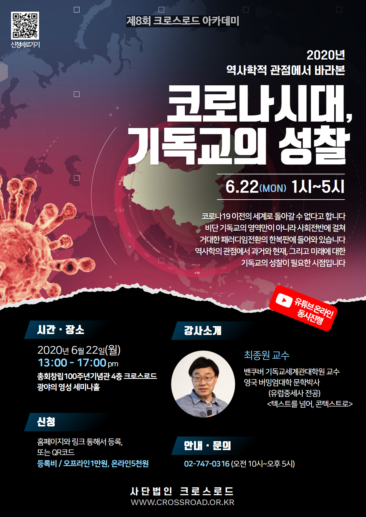 강사 : 최종원 교수(VIEW 밴쿠버 기독교세계관대학원) 날짜 : 2020년 6월 22일(월) 오후1시-5시 장소 : 서울시 종로구 대학로3길 29, 총회창립100주년기념관 사단법인 크로스로드 광야의영성홀(4층) 회비 : 오프라인 10,000원/ 온라인 5,000원