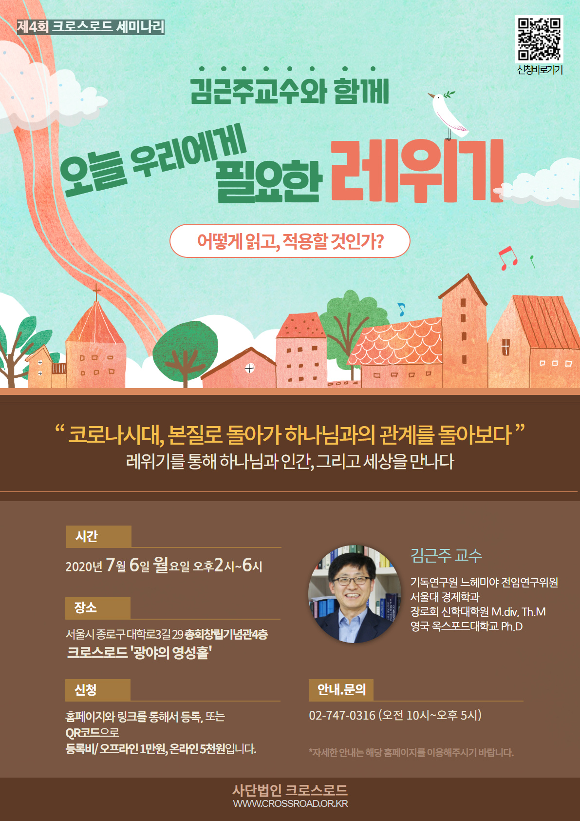 <제4회 크로스로드 세미나리 안내> 크로스로드 세미나리 4번째 시간입니다. 강사 : 김근주 교수(기독연구원 느헤미야) *** 입금하실 때 <4회 홍길동>이라고 남겨주세요. * 온라인 강의신청하신 분들에게는 강의안 제공과 함께 강의 당일 1시30분 전후로 문자와 이메일을 통해 강의접속하실 수 있는 온라인 주소를 보내드립니다. 강의신청하시고 입금후 문자주시면 확인하도록 하겠습니다. * 강의신청링크 https://forms.gle/5qsmWPR967g9RH5U6