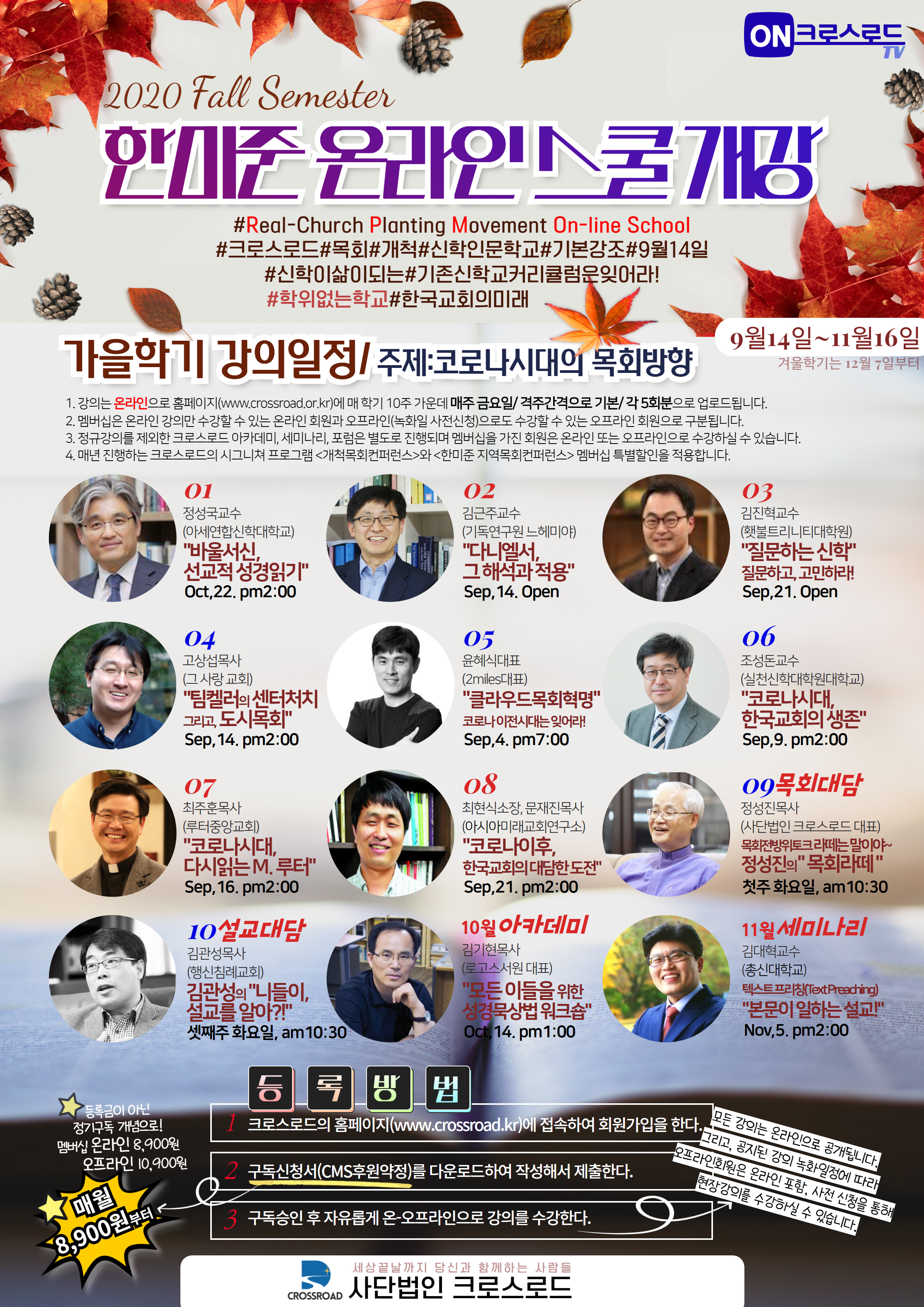 >>등록특전 매 학기 정해진 강의 외에도 크로스로드에서는 크로스로드 세미나리, 아카데미, 포럼 등의 특강이 매월 계획되어 있으며 멤버십을 가진 분들에 한해 무료로 오픈됩니다. 그리고, 크로스로드의 시그니쳐 프로그램인 <개척목회컨퍼런스>와 <한미준 지역목회컨퍼런스>에 멤버십 특별할인으로 참가하실 수 있습니다.
