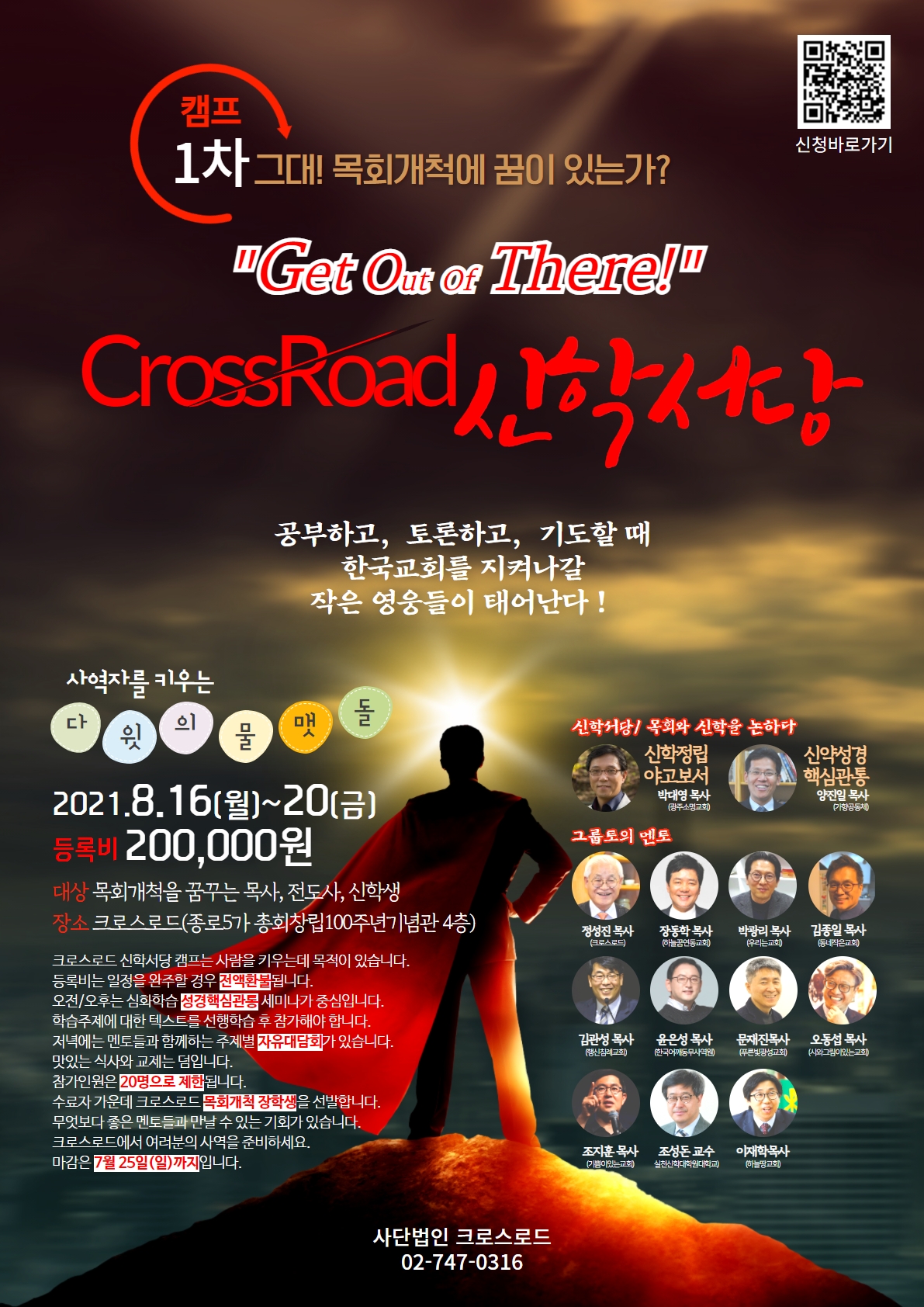 참가인원은 20명으로 제한됩니다. 수료자 가운데 크로스로드 목회개척 장학생을 선발합니다. 무엇보다 좋은 멘토들과 만날 수 있는 기회가 있습니다. 크로스로드에서 여러분의 사역을 준비하세요.