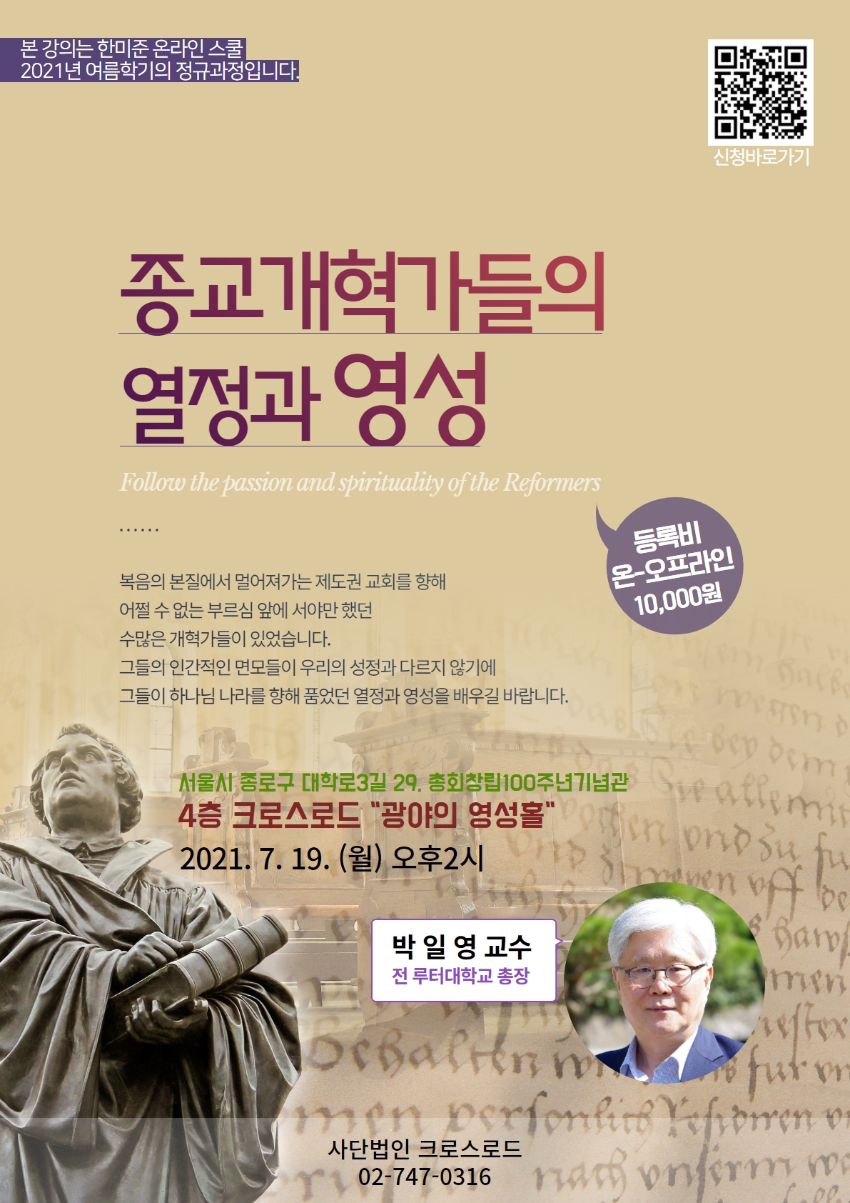 일시 : 2021년 7월 19일 월요일 오후2시-5시 장소 : 총회100주년기념관 4층 크로스로드 광야의영성홀 강사 : 박일영교수(전 루터대학교 총장) 회비 : 10,000원(온-오프라인 동일)